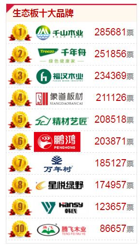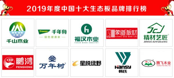 入选2019年度中国十大生态板品牌的品牌有:千山、千年舟、福汉、象道、精材艺匠、鹏鸿、万年树、星悦绿野、韩氏、腾飞。