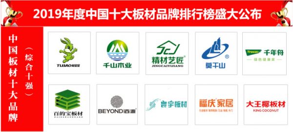 2019年度中国十大板材品牌排名:兔宝宝、千山、精材艺匠、莫干山、千年舟、百的宝、百源、寰宇、福庆、大王椰。