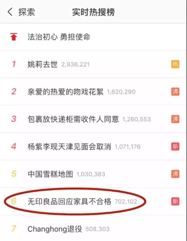 2019年7月19日,无印良品MUJI官方微博发布消息称,“近日有关媒体报道了北京市市场监督管理局关于流通领域家具类商品质量抽检结果公示,其中我公司所销售的6款家具不符合中国有关规定。对于本次事件,我公司向广大消费者郑重致歉。”同时,无印良品表示愿意为购买这6款家具的顾客提供退换货服务。北京商报记者发现,“无印良品回应家具不合格”的实时热搜曾达到第6位,热度超过70万。