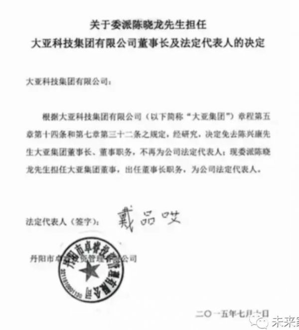 2015年7月10日,依据大亚集团公司章程规定,由陈兴康夫人戴品哎签发的卓睿投资管理有限公司委派书,任命二儿子陈晓龙为大亚集团董事长。两位儿子同时进入董事会,并做了业务归属的分割,二儿子陈晓龙掌管板材业务,大儿子陈建军掌管地板业务。