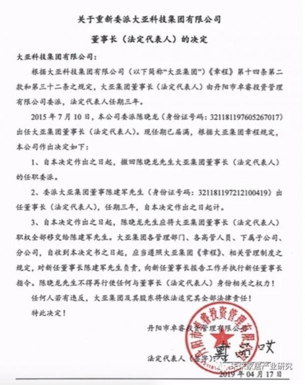 2019年4月17日,母亲戴品哎签发卓睿公司声明,由于三年任期届满,撤回对陈晓龙出任大亚集团董事长的委派,改派陈建军出任董事长。