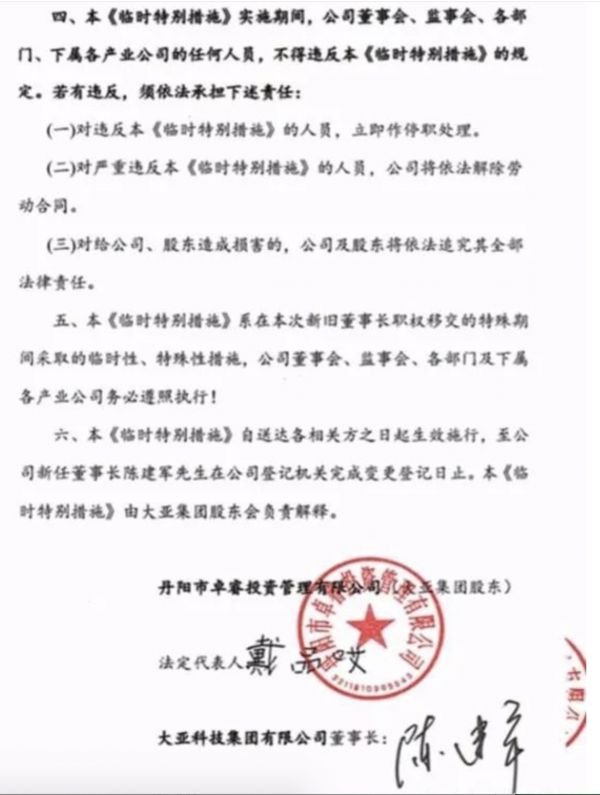 同日,陈建军以大亚集团董事长身份和母亲戴品哎共同发布了《大亚科技集团有限公司临时特别管理措施》,宣布大亚集团进入“临时特别措施时期”。