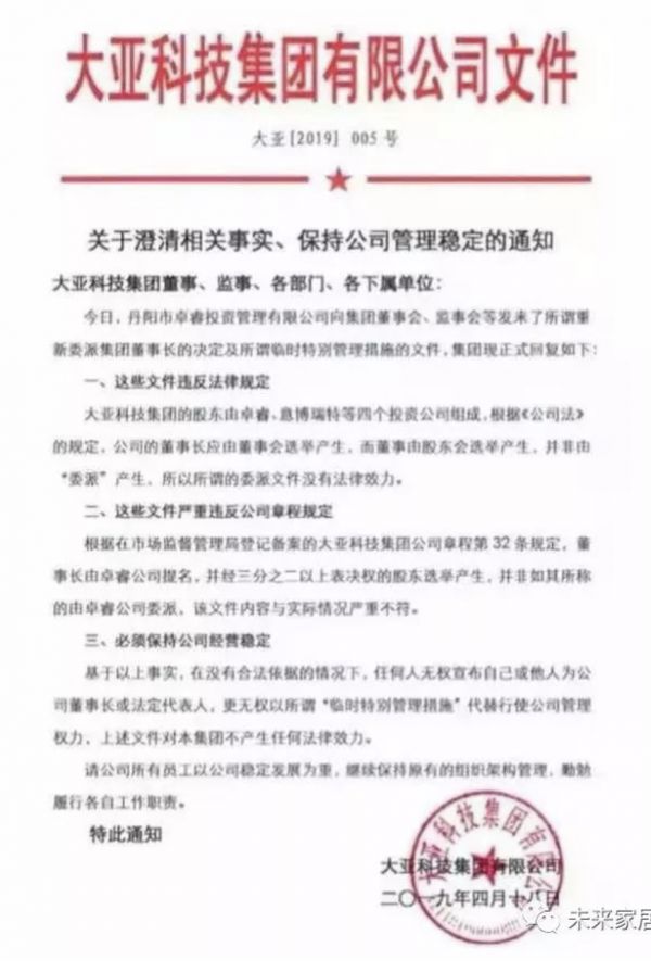 2019年4月18日,大亚集团发布文件称:根据《公司法》规定,公司董事长应由董事会选举产生,而董事由股东会选举产生,并非由“委派”产生;新委派的董事长和特别临时措施均无效。