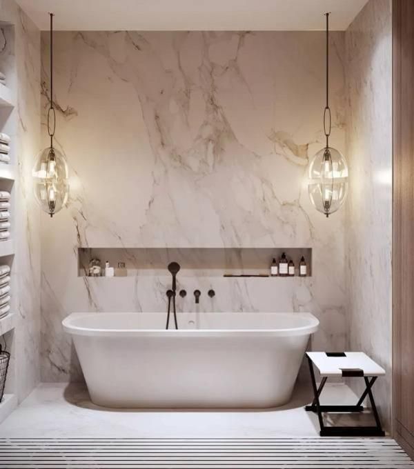 而且卫生间墙面可以运用壁龛的地方很多,浴缸旁边、淋浴房空间、马桶上方、立地式角落壁龛等,不仅可以收纳小物件还能够起到装饰作用。