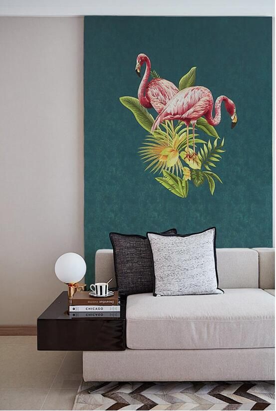 客厅大胆使用浅灰作为背景色,孔雀蓝背景墙的放置让整个客厅焕发生机,使整个空间更富于层次感。汇明A+墙布《火羽双影》整体色彩活跃、灵动,放置在客厅不仅为空间注入自然活力,张扬的火烈鸟更增加空间趣味,让人一见倾心。
