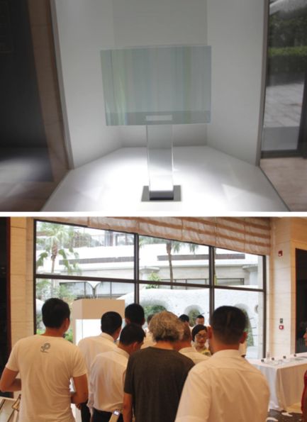 在发布会现场,大堂整齐摆放着“至纯“样品,在场人士无一不对这块“水晶”主角产生兴趣并由衷感叹,大家纷纷拿起手机拍照。常言道,鱼龙混杂真假难辨,火眼金睛不怕火炼,在近距离的广角镜头下,甚至不用镜头肉眼可见,“至纯”产品的通透度让其无法隐藏光芒,即使与形状一样的产品并排,也依旧清晰可辨别,谁是主角。