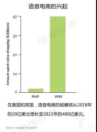 根据Juniper的数据,在美国和英国,语音电商的规模将从2018年的20亿美元增长至2022年的400亿美元。有趣的是,语音电商最热门的三大商品品类都是低价商品:生鲜杂货(20%)、娱乐(19%)和电子(17%)。