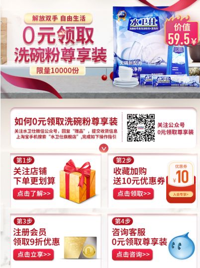 搜索微信公众号“水卫仕”,关注并回复“赠品”,按照操作指引就可以将价值59.9元的洗碗粉套装免费领回家!不要犹豫,动动手指,清净舒适的健康生活从水卫仕开始!