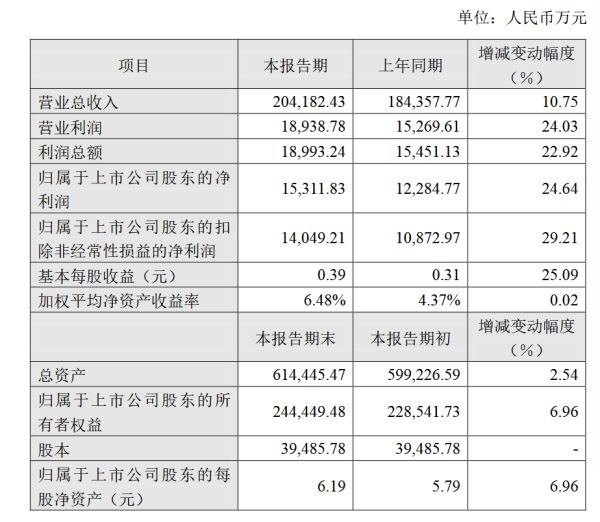 报告期内,公司实现营业收入20.42亿元,同比增长10.75%;归属于上市公司股东的净利润1.53亿元,同比增长24.64%。业绩提升的主要原因有: