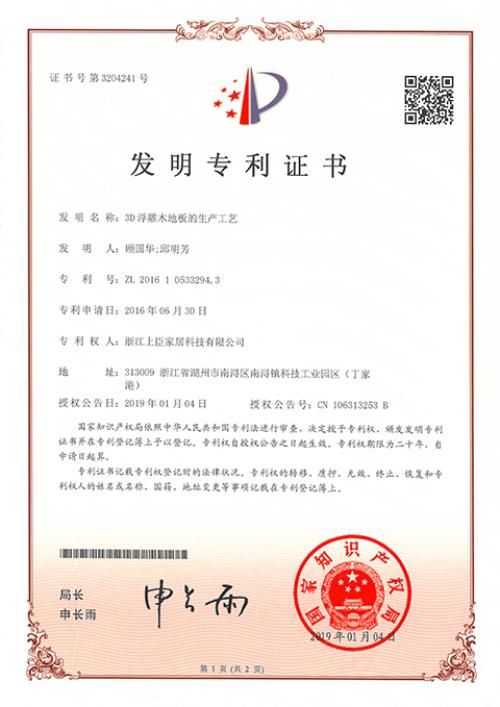 科技创新是企业发展的助推器,专利是衡量科技创新最有代表性的指标。自品牌创立以来,上臣地板致力于技术研发与创新,并取得了显著成效。截止目前,上臣地板已获得“三维布艺”、“净醛级”、“3D浮雕”等一系列国家级专利。而凭借在科研创新领域的技术积累和领先优势,上臣地板成为三项国家标准《实木地板》、《高耐磨漆饰实木地板》、《地采暖用实木地板技术要求》起草单位。
