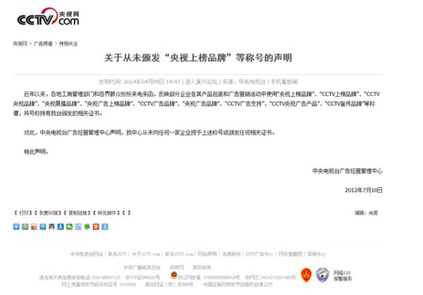 早在2006年3月和11月,中央电视台广告部、中国农业电影电视中心广告部就早已通过其官方网站发布了《关于部分企业擅自使用“央视上榜品牌”的严正声明》,文中强调中国电视台广告部从未向任何一家企业颁发过“央视上榜品牌”的称号或证书,企业行为也从未得到过中央电视台的许可和承认。