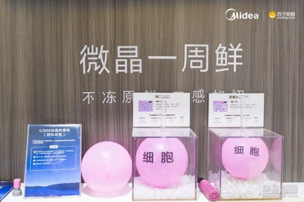 在美的冰箱正在进行的探鲜之旅暨新品发布全国巡展的1/300冰晶对比实验装置中,消费者也可以直观地看到,以同一大小的气球模拟的食材“细胞”在大冰晶的空间里极度容易破裂,而在小冰晶空间下的食材“细胞”却可以维持原样不变,以“显微镜式放大”保鲜下食材细胞的形式,完美地展现了微晶一周鲜下的“不冻原鲜”的技术效果。