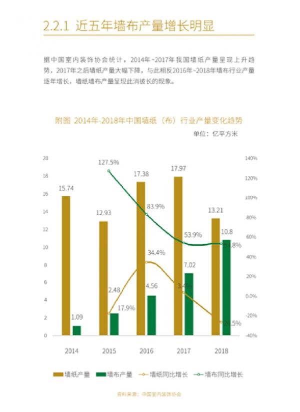 墙纸行业兴盛时期,从一百多元每卷的墙纸逐渐下沉到60-70元每卷,直到现在的10元、8元每卷。这是因为行业发展到一个小高峰,不可避免会面临产品研发瓶颈期,市面产品过剩,在供过于求的市场环境中,又无法通过短期的产品研发突围,一些企业自然而然就想尝试走低价竞争的路线来狂揽市场份额。本是无可厚非的做法,但市场的自我调节很容易失控,价格的一路低开,慢慢就造成很多墙纸经销商不再卖墙纸产品,因为没有了利润点。据《中国墙纸墙布行业白皮书》统计结果显示:“2014年~2017年我国墙纸产量呈现上升趋势,2017年之后墙纸产量大幅下降,与此相反2016年~2018年墙布行业产量逐年增长,墙纸墙布产量呈现此消彼长的现象。”