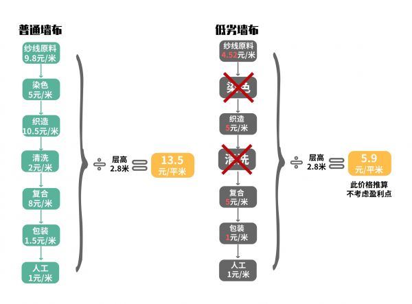 从最基本的纱线单位到一个完整的墙布产品,需要经过这几个基础步骤:纱线原料、染色、织布、清洗、复合、包装。当弄清一个产品的基础工序之后,便可尝试剖析产品的成本构成。我们可以预算一下一款普通墙布产品的成本。