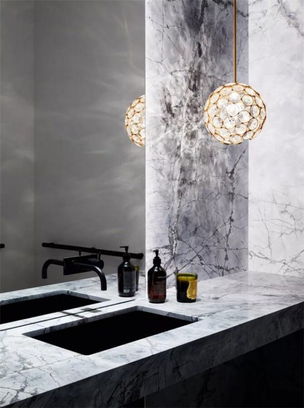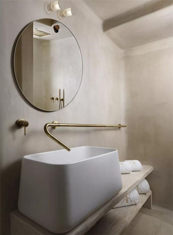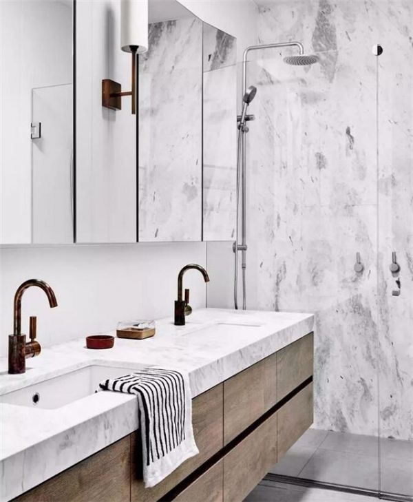 例如,在大理石打造的现代感卫浴间内搭配复古黄铜水龙头,在新与旧、光泽与暗哑间形成的鲜明对比,让整个空间变得不再单调,而且更具暖感。
