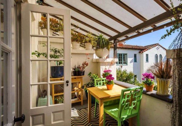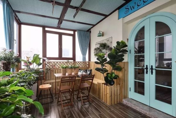 如果阳台是方形的,且三面都是玻璃窗户, 这时可以把小阳台设计成一个小休闲厅,种上绿色植物,摆上吊摇椅、休闲桌。一边休息一边欣赏窗外的风景也别有一番风味。