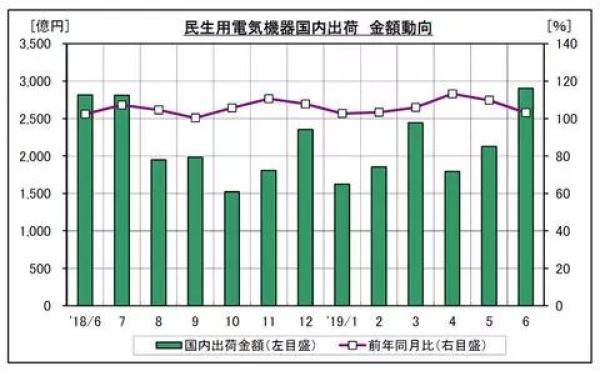 日本电气制造商协会于2019年6月公布了消费类电子产品的国内出货结果。出货量为2,905亿日元(约184.847亿人民币),比上年同月增长3.1%,连续14个月为正。
