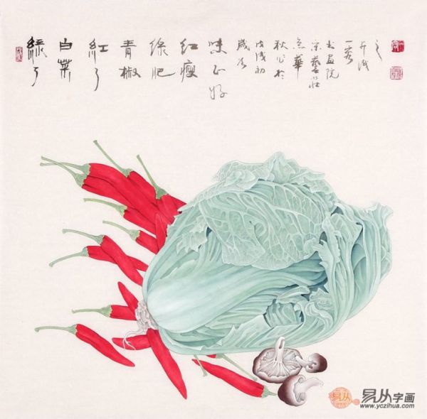 看似很常见的物品在她笔下却绘制的淋漓尽致、逼真传神。此幅吉利国画百财图,集白菜、蘑菇、辣椒于一身,构图巧妙,造型奇特,色韵酣畅,设色典雅,挂于室内美化环境,愉悦心情!