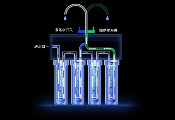 领尚双出水反渗透净水器内置四层过滤网,四重过滤:双层过自来水,四层过饮用水。