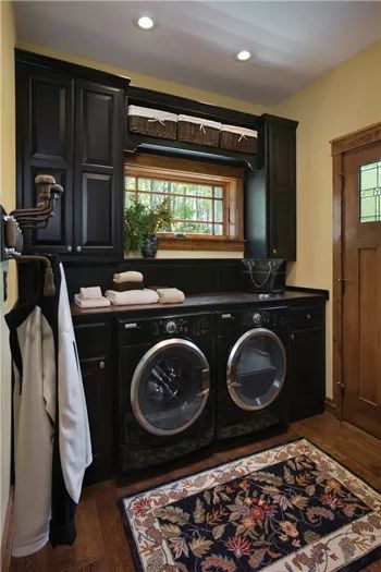 除了实用外,想不到洗衣房也能成为代表你品味的一角。美式家居风格搭配黑色的洗衣房,非常酷!黑色的组合柜几乎将洗衣机隐形了,搭配花色的地毯提亮整个空间,小空间运用全黑色也不会那么压抑了!