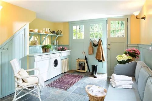 田园风格一直都被不少人所喜爱,除了养眼之外,田园风格带给人更多的生活的气息。洗衣房在黄色与淡蓝色的融合的颜色里,就像在日光下的天空般温暖,给人恬静的感觉!