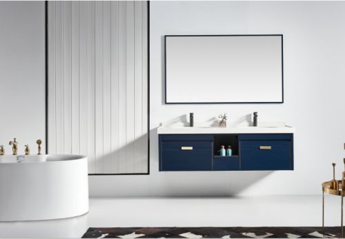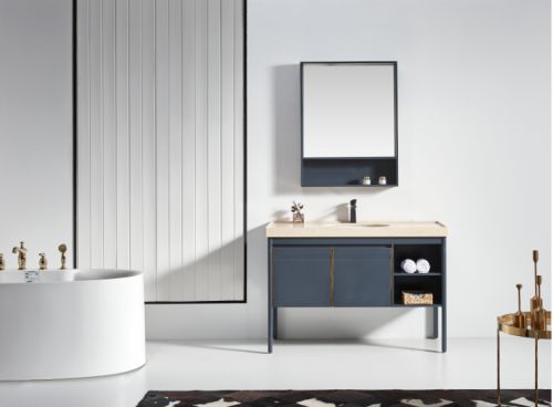 据说蓝色是最受欢迎的颜色,不管是海军蓝、湖蓝还是雾霾蓝。其中,雾霾蓝是一种带有一点灰色调,还有一点复古的蓝色。采用雾霾蓝色调的单品,往往更沉静也更具有高级感。这款采用雾霾蓝为主色,辅以金色点缀的浴室柜,像极了一位睿智、成熟、优雅、理性的绅士,让人心情舒适、愉悦。