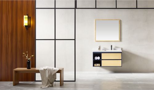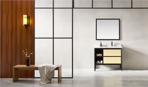 明亮的淡黄色让人眼前一亮,有种耳目一新、豁然开朗的通透感。雾霾蓝的线条边框又让色彩不至于太亮、过于散漫,是一款适合打造明快卫浴空间的浴室柜。