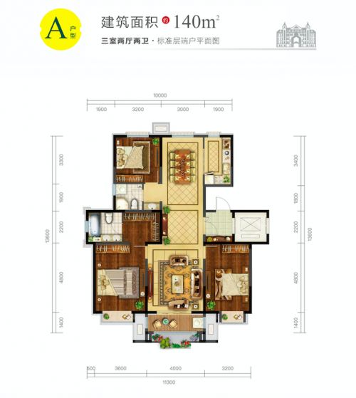 以建筑面积约140㎡的A户型为例,从户型图中可以看出这是一个三室两厅两卫的户型。其户型方正,进深面宽比为黄金比例1.2,通透的户型和大量露台、阳台的加持使得空间得到进一步延伸。