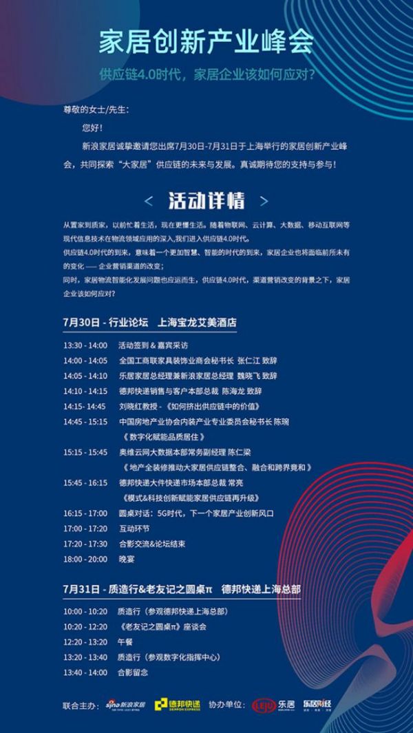 作为2019首站中国家居创新产业峰会,新浪家居将携手德邦快递,于7月30日在上海与行业重磅嘉宾共话“供应链 4.0时代”。