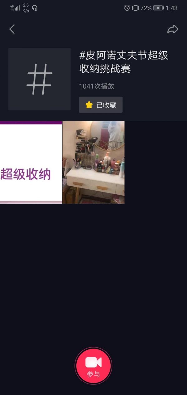 2.搜索“皮阿诺丈夫节超级收纳挑战赛”进入话题挑战页面,点击参与,录制或上传视频,同时@皮阿诺橱柜官方号,点击发布即可;