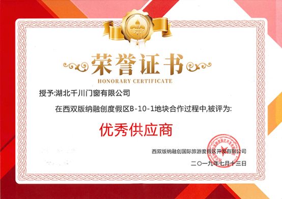 千川在工程项目方面再获喜讯。继6月荣获中海地产“优秀合作商”后,近日千川木门又在西双版纳融创度假区项目中荣获“优秀供应商”称号。