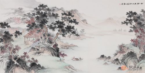 【客厅沙发背景墙挂一幅这样的山水画,有一种古色古香,淡雅古韵的艺术韵味,色彩是明亮的,构图丰富的,山水充满了柔美的氛围。】