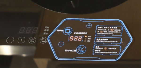 值得一提的是,这款燃气灶采用了横向式的液晶屏,多种智能功能“定时“、”定温‘’、‘’煮水”等依需触控切换,使得消费者日常使用更加方便。四大功能键在黑色面板上依次排开,整体性很强,点亮为橙色即是运行状态。