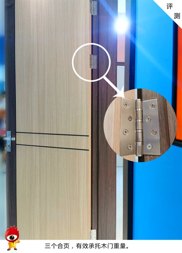 有些用户可能会发现,木门用了三五年,或更短的时间,就会下坠蹭到地面,开合发出“吱吱吱”的响声,其实这是由于合页承重不够所造成的。领尚免漆门LS-X010配有三个合页,上部两个下部一个,能很好地承托住木门的重量,使木门不容易下坠而影响使用。