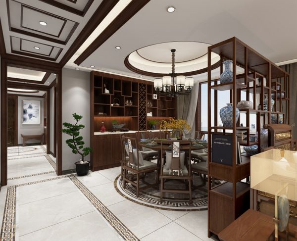中式风情透过摆满了青花瓷瓶的博古架,把典雅风韵无偿地献给一家六口的圆润餐桌椅。