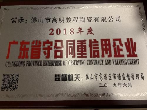 骏程陶瓷自成立以来,始终秉承以服务为先 品质为上的宗旨,以诚信经营为守则,坚持匠心精神,在此次多家高规格企业评选中荣获“2018年度广东省守合同重信用企业”荣誉称号。