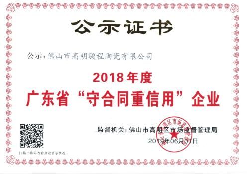 骏程陶瓷获“2018年度广东省守合同重信用企业”荣誉称号
