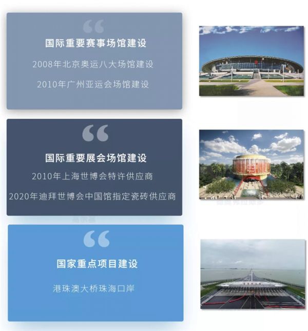 蒙娜丽莎一直积极参与北京奥运会、广州亚运会、上海世博会等国际赛事、展会以及港珠澳大桥等国家重大项目的建设,展现中国品牌的担当和责任。在这个世界大合唱的新开放时代下,蒙娜丽莎一步一个台阶站在世界舞台上,通过一次次的闪耀时刻,彰显蒙娜丽莎品牌的卓越品质和社会责任担当,向世界展现中国品牌的实力。蒙娜丽莎正是以优异的品牌实力参与到迪拜世博会中国馆的建设中,展现中国品牌的底蕴,代表行业展现中国建筑陶瓷产业制造的发展实力。
