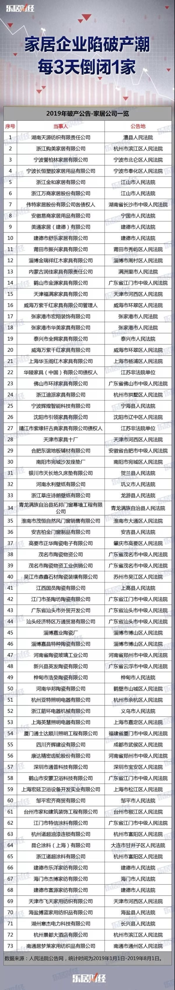 进入2019年,倒闭态势延续,中小家居企业未能幸免。乐居财经根据人民法院公告网公开信息统计,截止8月1日,今年开年以来已有73家家居企业宣布破产,涵盖:家具、地板、壁纸、门窗、陶瓷、照明、卫浴、涂料、家纺等几乎全品类。