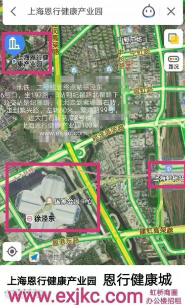 上海恩行健康城,办公楼招租,位于虹桥国家会展中心附近两公里,闵行区华漕镇政府斜对面,可以用百度地图、腾讯地图、高德地图直接搜索上海恩行健康城,导航直达楼下。