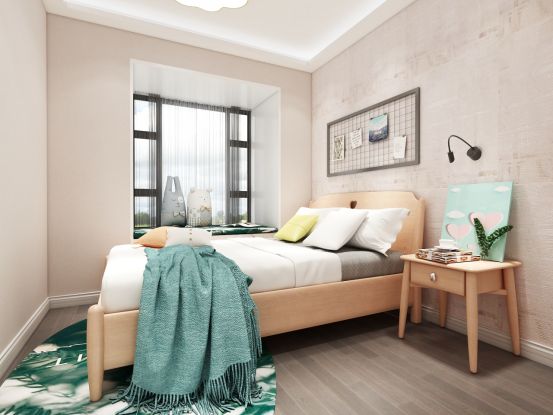 卧室延续公共空间配色,以原木色为主,搭配薄荷绿的饰品,颇有一股复古的味道。
