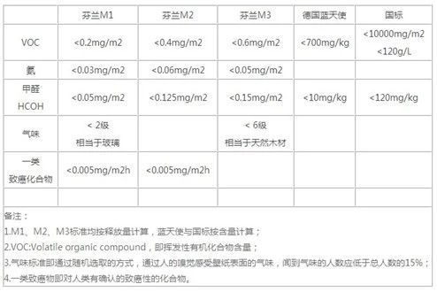 由于德国蓝天使、芬兰M1、室内空气排放标准A+、日本F4星、国标与欧标E1的检验方式不同,不能进行横向比较。