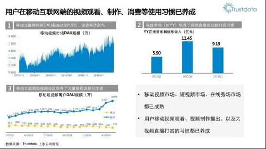根据Trustdata发布的《2016年移动视频直播分析报告》,移动视频市场DAU规模最高达到1.5亿,渗透率达20%,这也造成了秒拍、小咖秀、映客等短视频平台的迅速崛起,视频创作和直播在2016年站到了风口,短视频也成为当前移动互联网时代人们最喜闻乐见的传播形式。