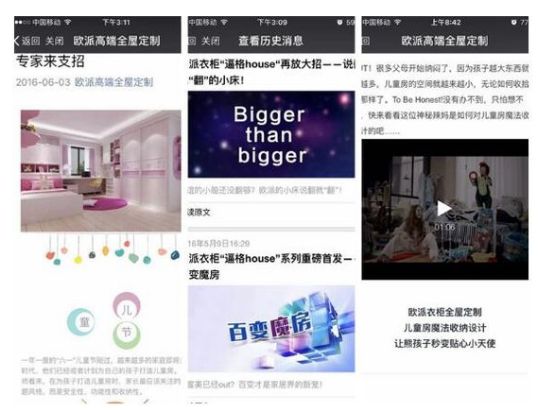 纵观欧派衣柜这一年的营销模式发现,营销方式上,实现了从“JPG—GIF—AVI”的转变,也就是说,从原来的“图文形式—动图—创意视频”的改变。从“欧派高端全屋定制”公众号上,我们看到,欧派衣柜从最初图文形式推送到“big house”系列gif的升级,再到本次创意短视频“AVI”的尝试。而无论是哪种形式,最终都是以产品本身为主,让产品自己说话。