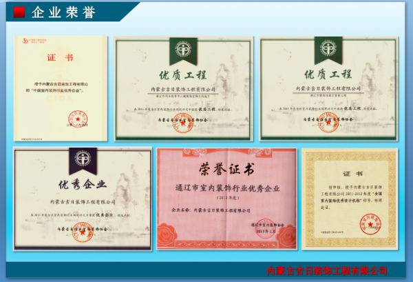 公司在设计理念上突出“精、美、独、特,以人为本”的艺术风格;在工程质量上坚持诚信为本、科学管理、精雕细琢、优质高效的质量方针。以单位工程合格率100%,优质工程90%,回访保修履约率100%的质量目标,赢得了较高的社会信任度和多项荣誉。多年来,先后有多项工程被国家、内蒙古自治区、通辽市评为优质工程和样板工程。同时公司先后被国家、内蒙古自治区、通辽市评为国家级、省级、市级优秀施工企业,设计作品在国家级和省级设计大赛中多次获奖,业绩突出的专业技术人员先后被评为“优秀项目经理”“优秀设计师”和“全国室内装饰行业优秀企业家”荣誉称号。