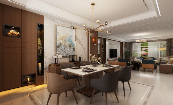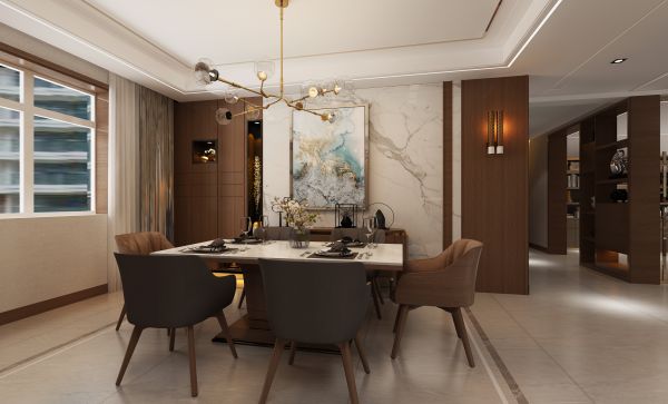 银川新房装修案例赏析:将自然山水融入餐厅空间,同时辅以木色系和灰白色系家具做搭配,简洁内敛,传达居者对细节的注重和对生活品质的追求。