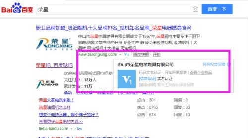 网友只需要百度搜索荣星电器或中山市荣星电器燃气有限公司,找到荣星带V的网站链接,将鼠标移至V处,即可查看荣星品牌获得的百度信誉V的简要说明;也可以点击百度V标识,查看荣星电器百度信誉V的详细内容。
