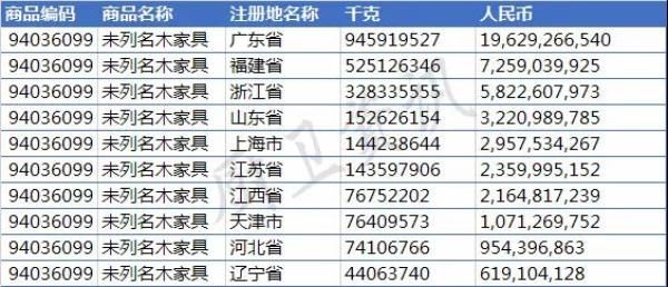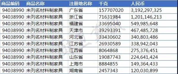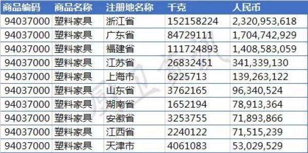 中国出口的“木制”家具主要出口商集中在广东、福建、浙江、江苏等省份,其中与浴室柜相关的94036099、94037000、94038990编号的产品主要出口地为广东、福建、浙江,其中塑料家具浙江省是最大出口省份。