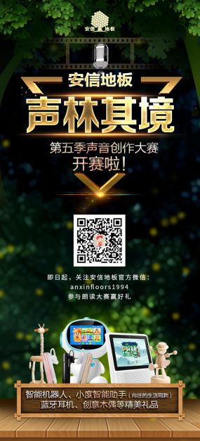 安信地板第5季声音大赛又双叒叕开赛啦~~,连续五年,从经典诵读到乡音趣读,在到为爱朗读,每年夏天都奉上一桌文化视觉听觉的文化盛宴。今年与以往的不同,增加更多互动性和趣味性,加入了来自南美洲、非洲、东欧、东南亚原始森林声音,在繁芜的世界里,与自然的一场灵魂的对话,打造人与自然融为一体生活,在不断加快的生活节奏中,依然坚守初心。行走山水间,畅享慢生活,同时还有AI智能机器人等丰厚礼品等你拿来。
