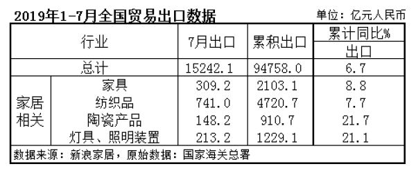 前7个月,包括纺织品、家具在内的7大类劳动密集型产品合计出口1.82万亿元,增长7.8%,占我国出口总值的19.2%。家具,灯具、照明装置及零件,陶瓷制品和纺织制品4类家居行业相关产品1-7月累计出口额8963.6亿元。